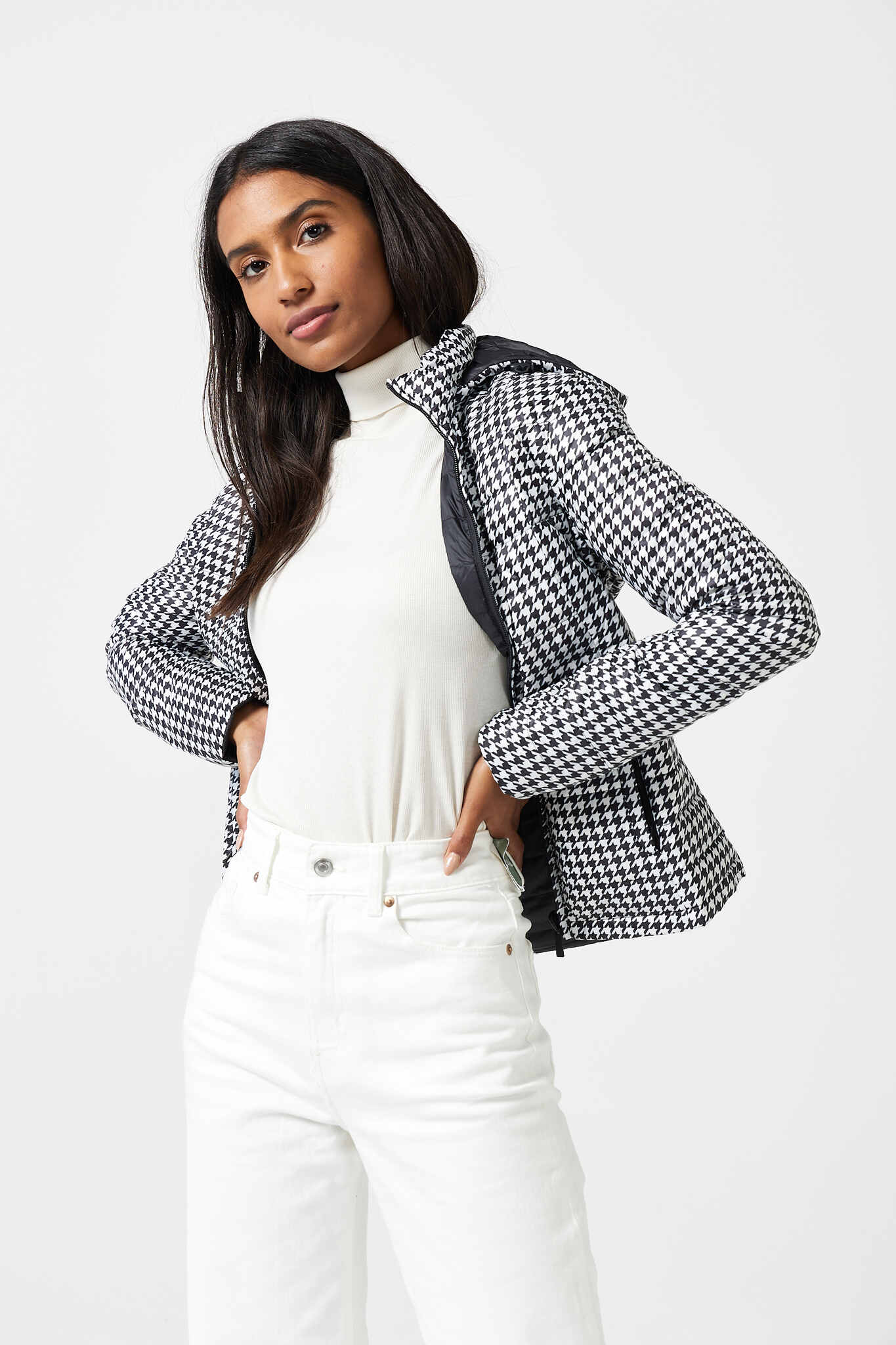 印花永远不会过时。黑色千鸟格羽绒夹克可轻松让您从白天到夜晚、从休闲到正式。单色配色可与您衣柜里的所有物品相配,而几何印花可为任何服装增添趣味和细节。卷入配套的旅行袋中,您可以随身携带您的小包,无论去哪里都能感受到温暖和快乐!